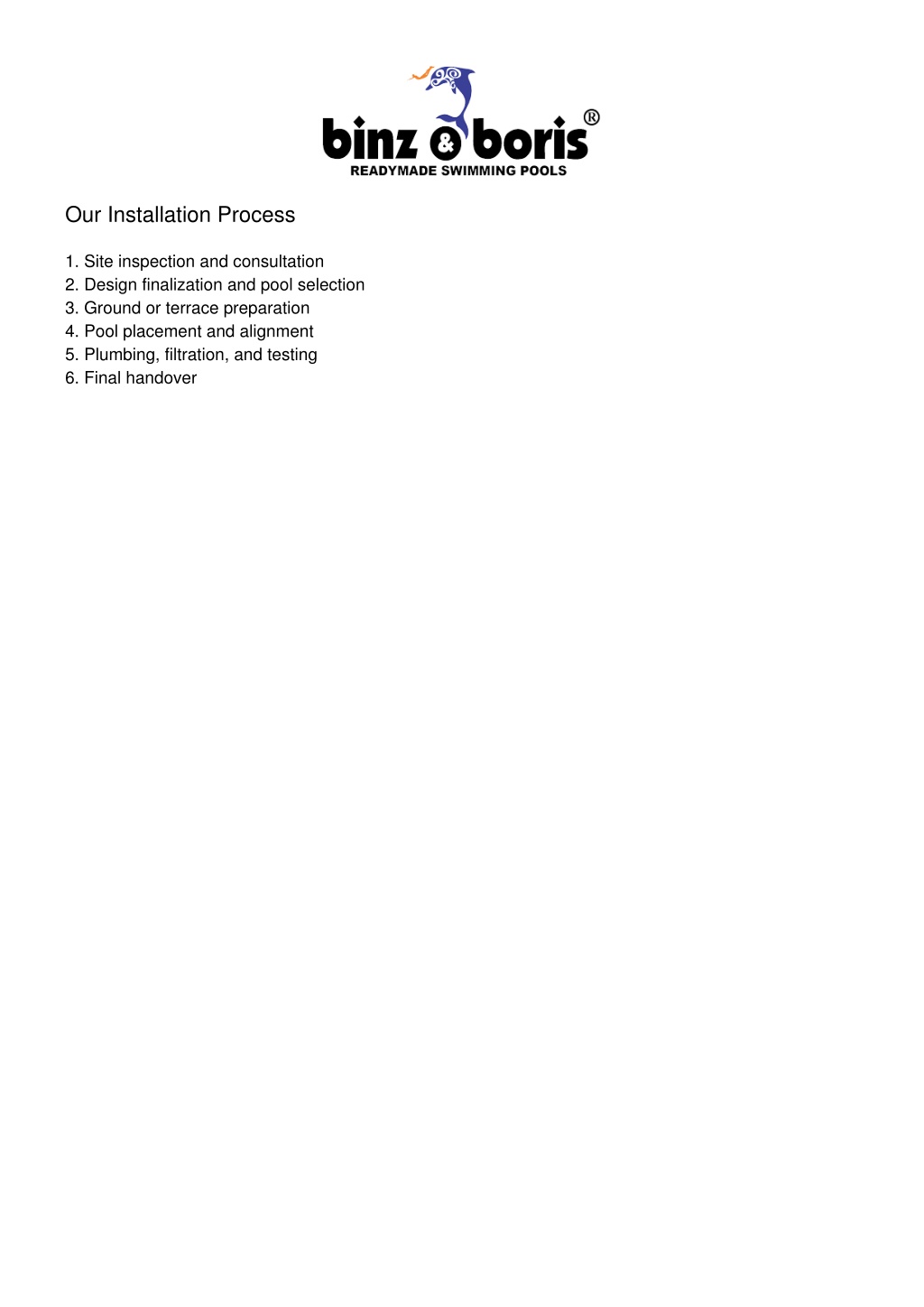 Our Installation Process 1. Site inspection and consultation 2. Design finalization and pool selection 3. Ground or terrace preparation 4. Pool placement and alignment 5. Plumbing, filtration, and testing 6. Final handover