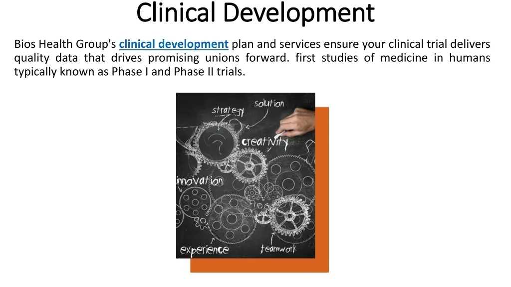 Clinical Development Bios Health Group's clinical development plan and services ensure your clinical trial delivers quality data that drives promising unions forward. first studies of medicine in humans typically known as Phase I and Phase II trials.
