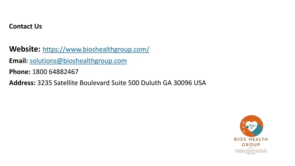 Contact Us Website: https://www.bioshealthgroup.com/ Email: solutions@bioshealthgroup.com Phone: 1800 64882467 Address: 3235 Satellite Boulevard Suite 500 Duluth GA 30096 USA