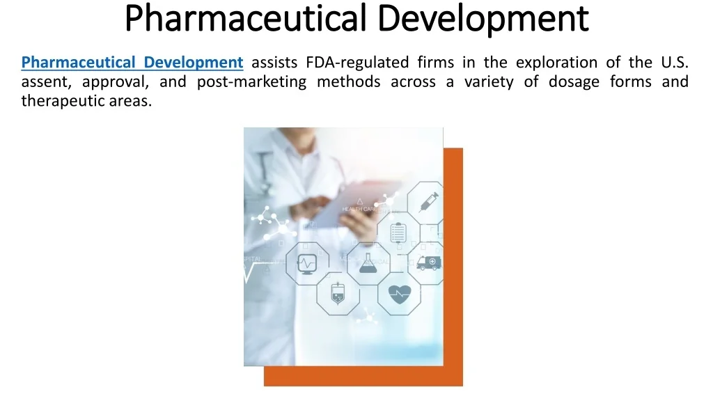 Pharmaceutical Development Pharmaceutical Development assists FDA-regulated firms in the exploration of the U.S. assent, approval, and post-marketing methods across a variety of dosage forms and therapeutic areas.