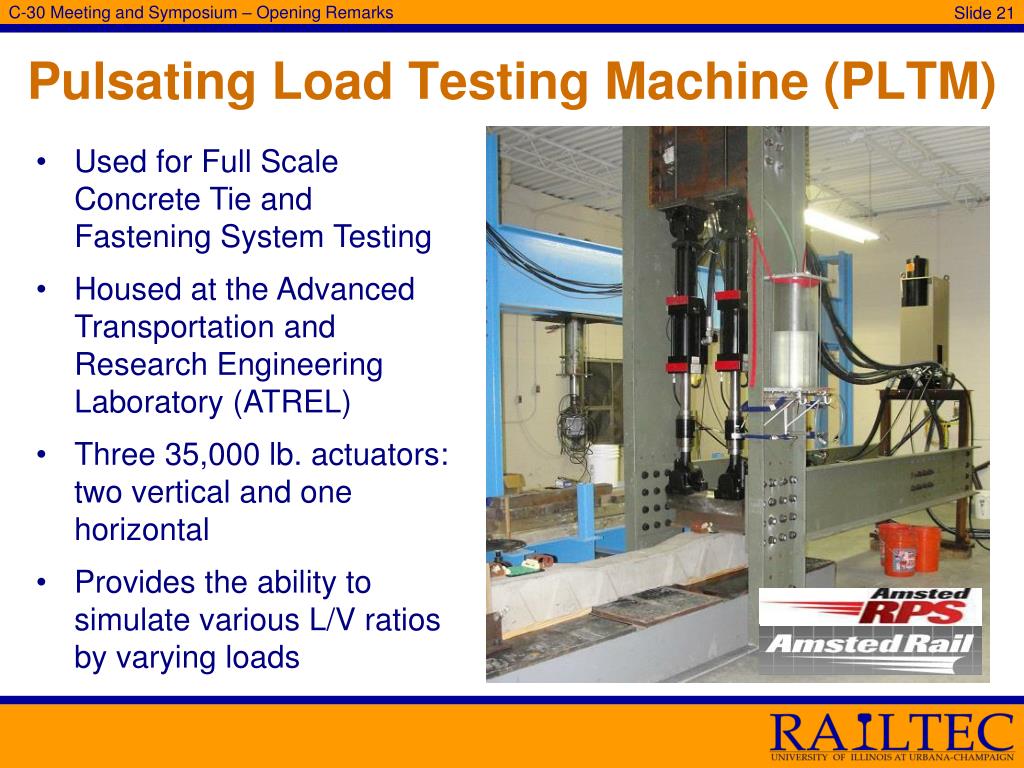 Used for Full Scale Concrete Tie and Fastening System Testing Housed at the Advanced Transportation and Research Engineering Laboratory (ATREL) Three 35,000 lb. actuators: two vertical and one horizontal Provides the ability to simulate various L/V ratios by varying loads Pulsating Load Testing Machine (PLTM)