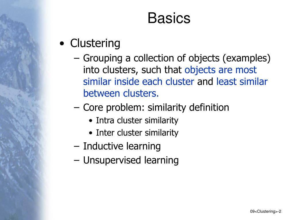 Basics • Clustering • Grouping a collection of objects (examples) into clusters, such that objects are most similar inside each cluster and least similar between clusters. • Core problem: similarity definition • Intra cluster similarity • Inter cluster similarity • Inductive learning • Unsupervised learning