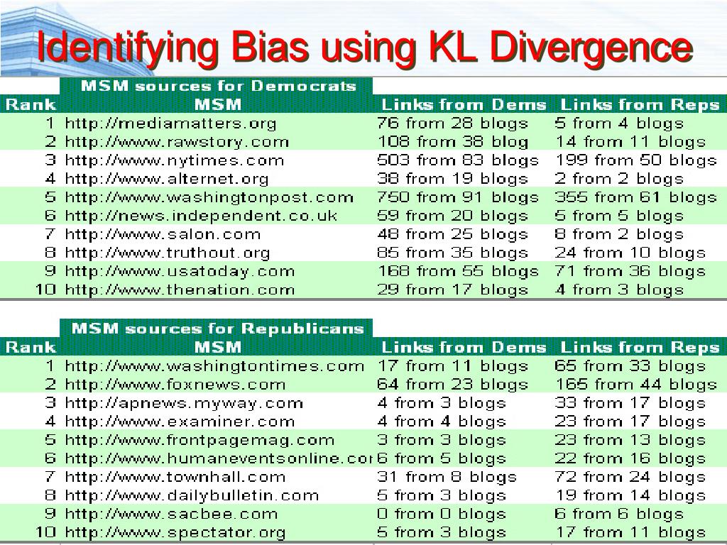 Link Polarity and Bias • Linking alone is not indicator of influence • Polarity (+/- sentiment) indicates type of influence • Consistent negative/positive opinion indicates bias • Link polarity/citation signal helps determine trust Strong Negative Opinion Strongly Positive opinion Mildly Negative opinion Democrat Blog Republican Blog