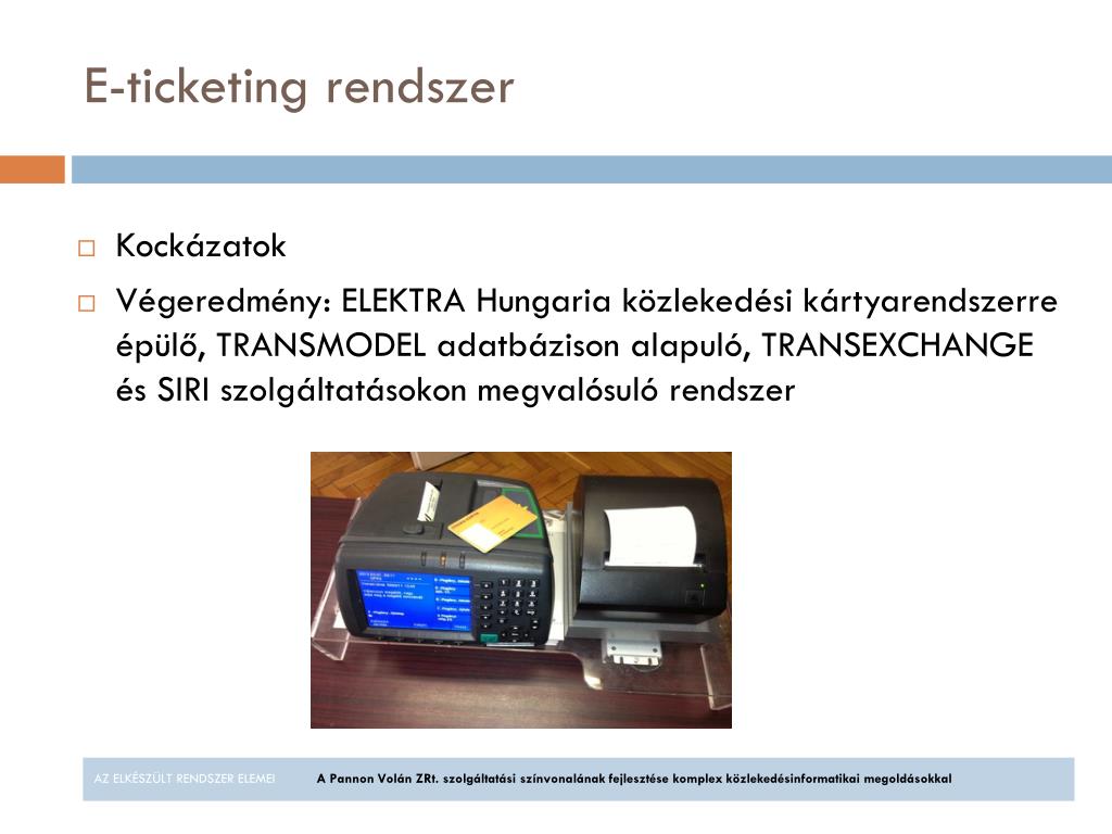 E-ticketing rendszer • Kockázatok • Végeredmény: ELEKTRA Hungaria közlekedési kártyarendszerre épülő, TRANSMODEL adatbázison alapuló, TRANSEXCHANGE és SIRI szolgáltatásokon megvalósuló rendszer AZ ELKÉSZÜLT RENDSZER ELEMEIA Pannon Volán ZRt. szolgáltatási színvonalának fejlesztése komplex közlekedésinformatikai megoldásokkal