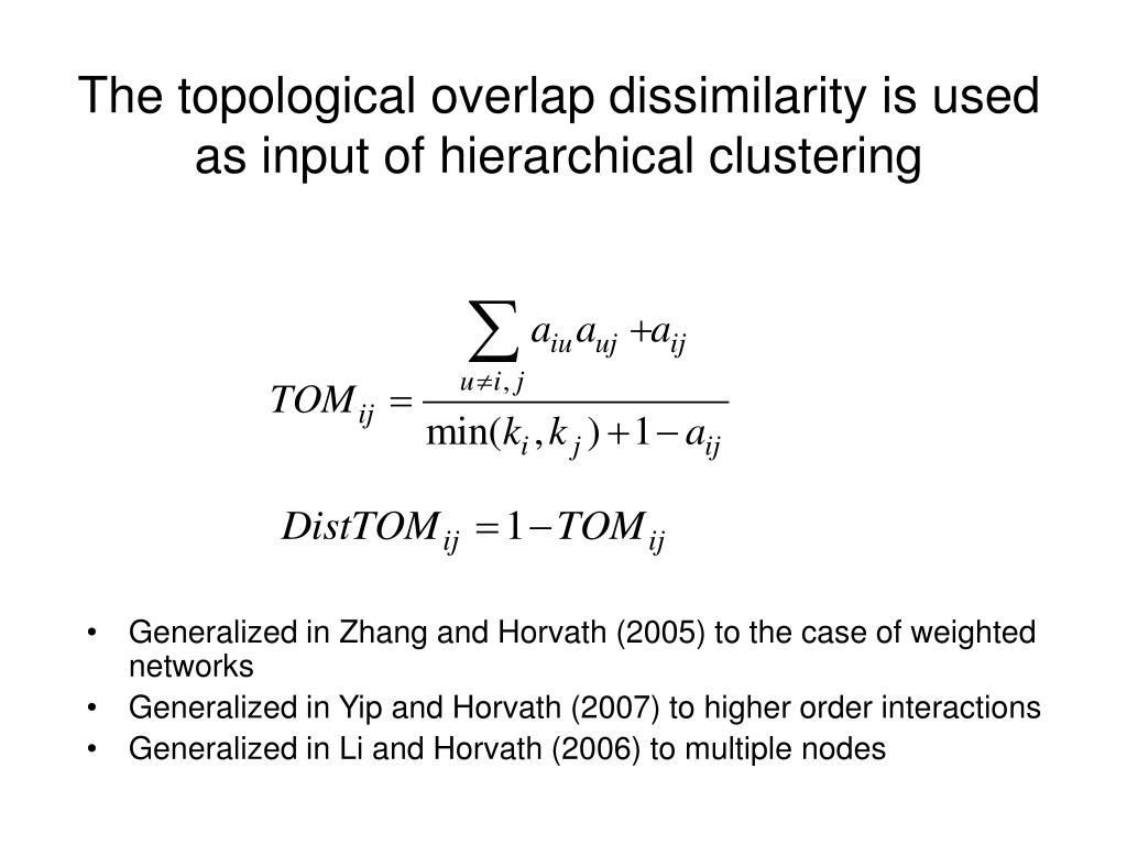 The topological overlap dissimilarity is used as input of hierarchical clustering • Generalized in Zhang and Horvath (2005) to the case of weighted networks • Generalized in Yip and Horvath (2007) to higher order interactions • Generalized in Li and Horvath (2006) to multiple nodes