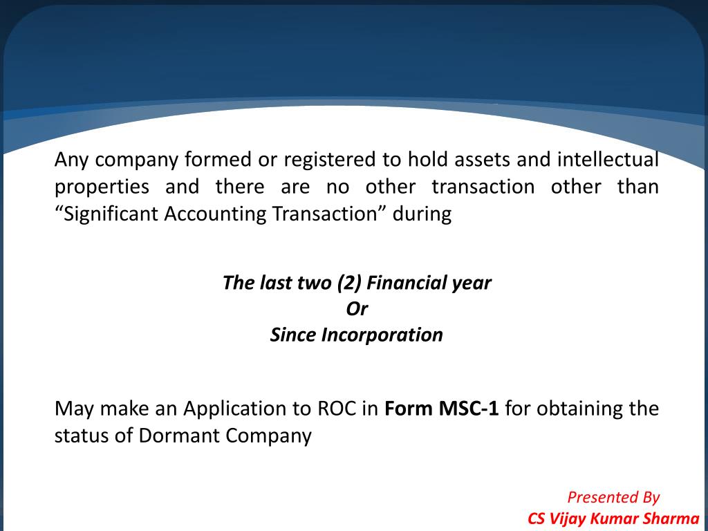 Any company formed or registered to hold assets and intellectual properties and there are no other transaction other than “Significant Accounting Transaction” during The last two (2) Financial year Or Since Incorporation May make an Application to ROC in Form MSC-1 for obtaining the status of Dormant Company Presented By CS Vijay Kumar Sharma