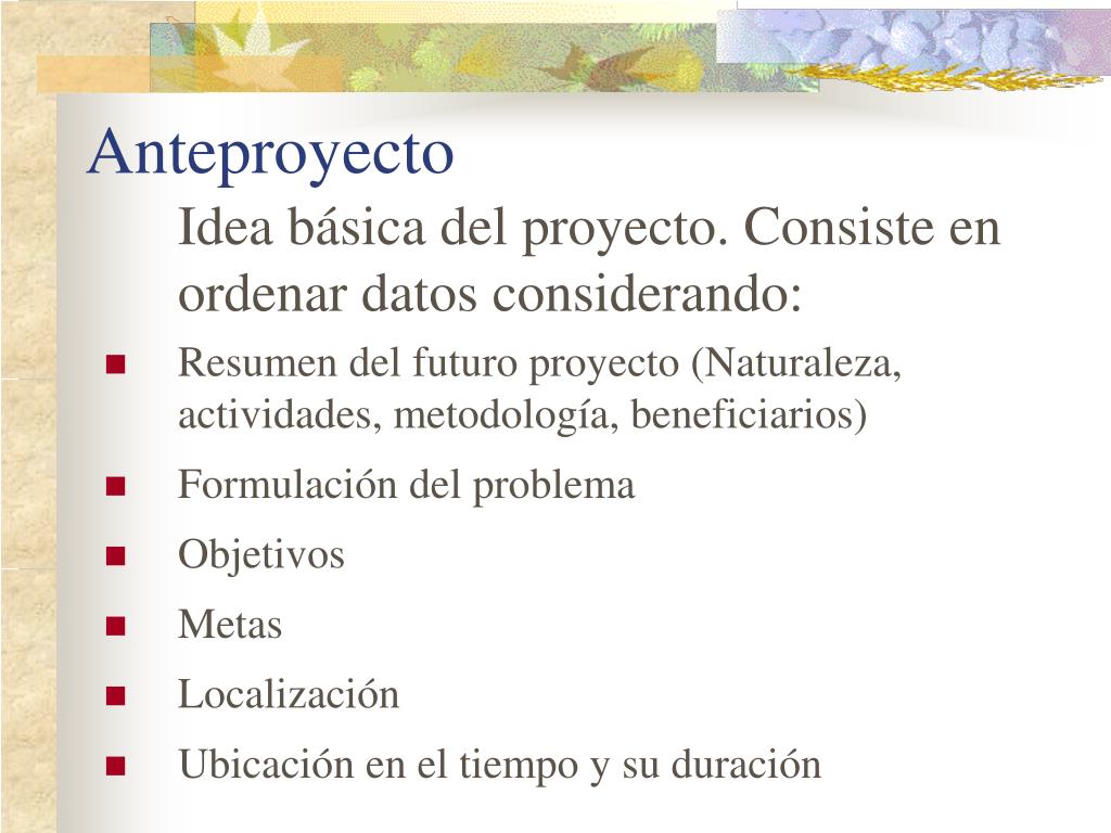 Anteproyecto Idea básica del proyecto. Consiste en ordenar datos considerando: • Resumen del futuro proyecto (Naturaleza, actividades, metodología, beneficiarios) • Formulación del problema • Objetivos • Metas • Localización • Ubicación en el tiempo y su duración