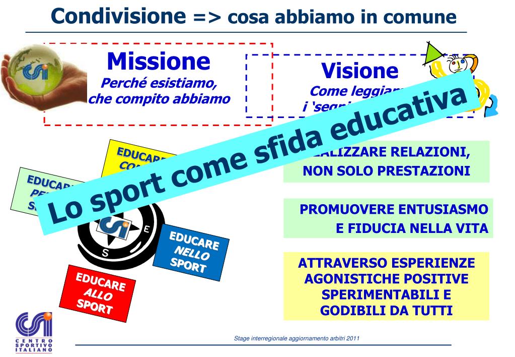Condivisione => cosa abbiamo in comune Missione Perché esistiamo, che compito abbiamo Visione Come leggiamo i ‘segni dei tempi’ Lo sport come sfida educativa REALIZZARE RELAZIONI, NON SOLO PRESTAZIONI EDUCARE CONLO SPORT EDUCARE PER LO SPORT PROMUOVERE ENTUSIASMO E FIDUCIA NELLA VITA EDUCARE NELLOSPORT ATTRAVERSO ESPERIENZE AGONISTICHE POSITIVE SPERIMENTABILI E GODIBILI DA TUTTI EDUCARE ALLOSPORT