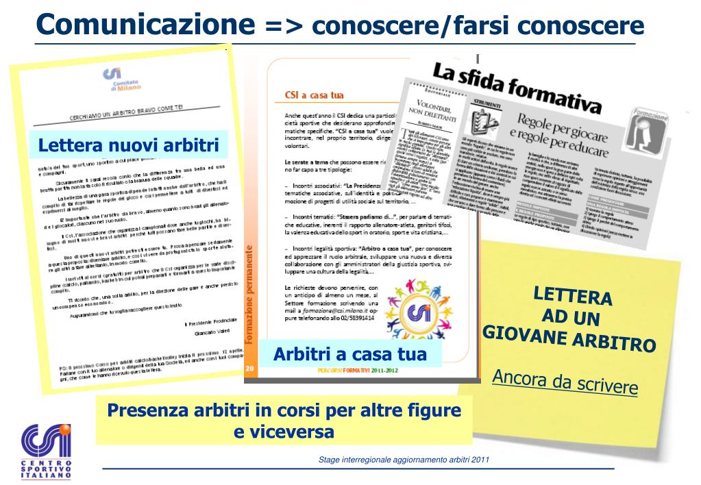 Comunicazione => conoscere/farsi conoscere Lettera nuovi arbitri LETTERA AD UN GIOVANE ARBITRO Ancora da scrivere Arbitri a casa tua Presenza arbitri in corsi per altre figure e viceversa
