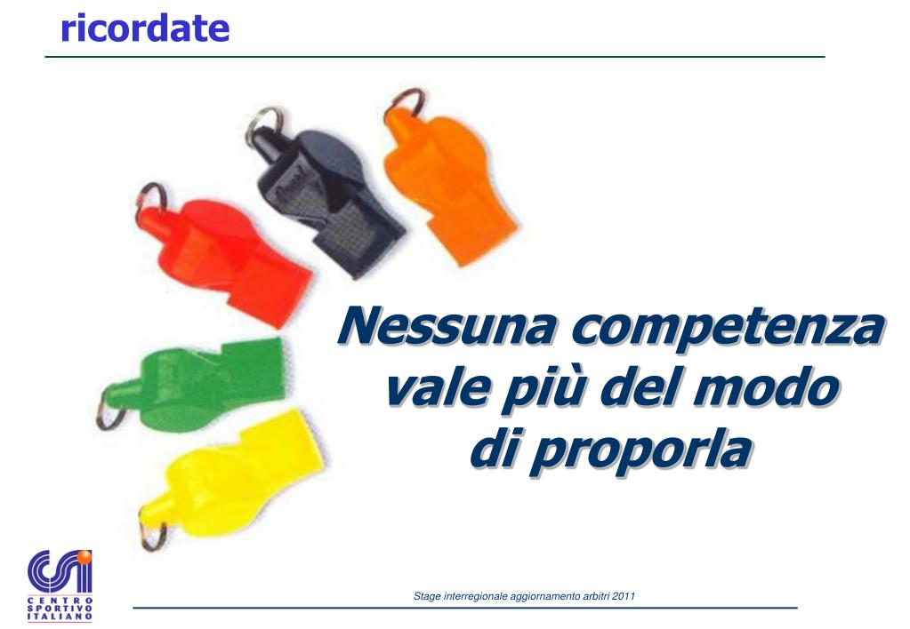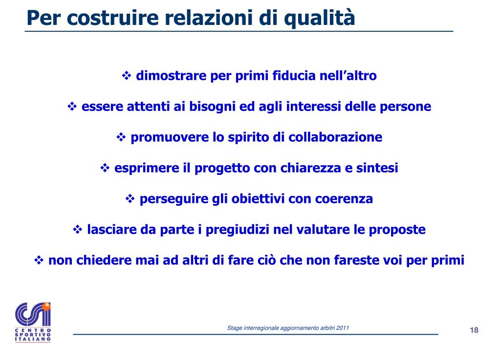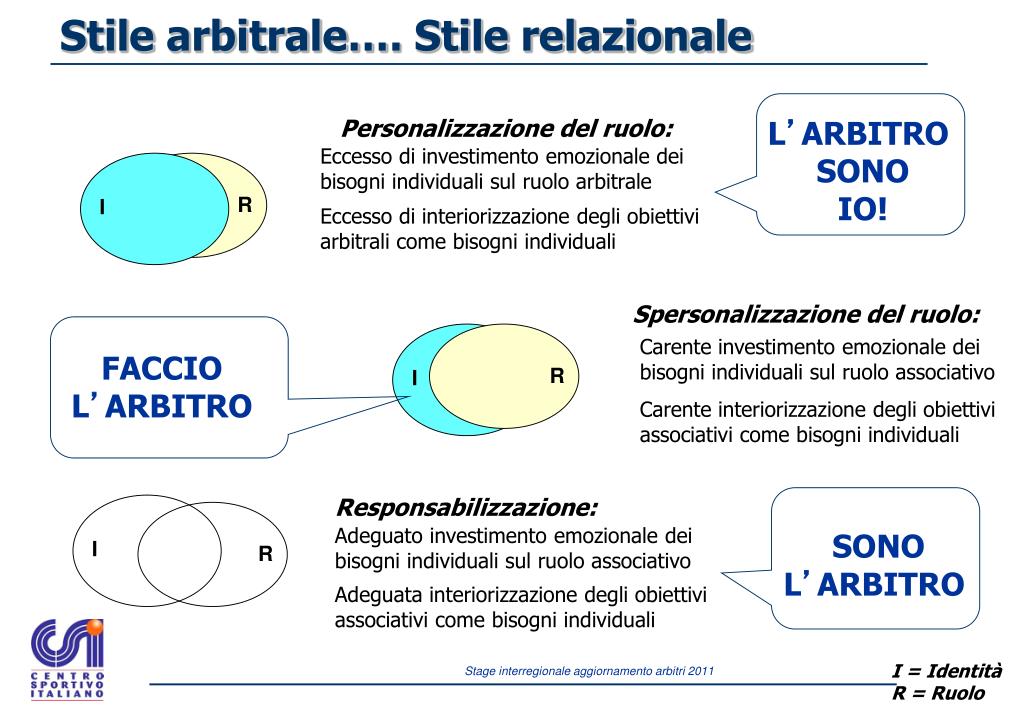 Personalizzazione del ruolo: Eccesso di investimento emozionale dei bisogni individuali sul ruolo arbitrale I I Eccesso di interiorizzazione degli obiettivi arbitrali come bisogni individuali Spersonalizzazione del ruolo: R R R Carente investimento emozionale dei bisogni individuali sul ruolo associativo Carente interiorizzazione degli obiettivi associativi come bisogni individuali Responsabilizzazione: Adeguato investimento emozionale dei bisogni individuali sul ruolo associativo I Adeguata interiorizzazione degli obiettivi associativi come bisogni individuali Stile arbitrale…. Stile relazionale L’ARBITRO SONO IO! FACCIO L’ARBITRO SONO L’ARBITRO I = Identità R = Ruolo