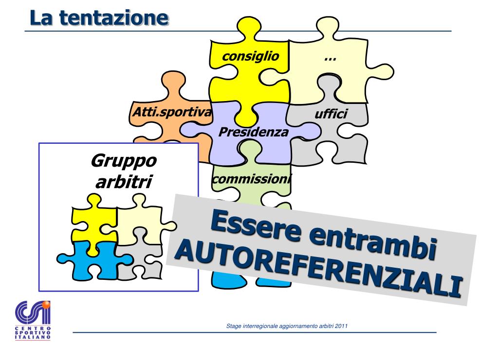 La tentazione consiglio … Atti.sportiva uffici Presidenza Gruppo arbitri commissioni Essere entrambi AUTOREFERENZIALI formazione