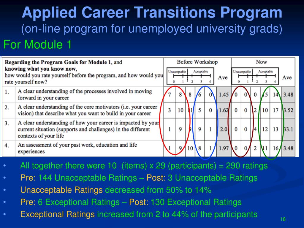 Applied Career Transitions Program(on-line program for unemployed university grads) For Module 1 • All together there were 10 (items) x 29 (participants) = 290 ratings • Pre: 144 Unacceptable Ratings – Post: 3 Unacceptable Ratings • Unacceptable Ratings decreased from 50% to 14% • Pre: 6 Exceptional Ratings – Post:130 Exceptional Ratings • Exceptional Ratings increased from 2 to 44% of the participants