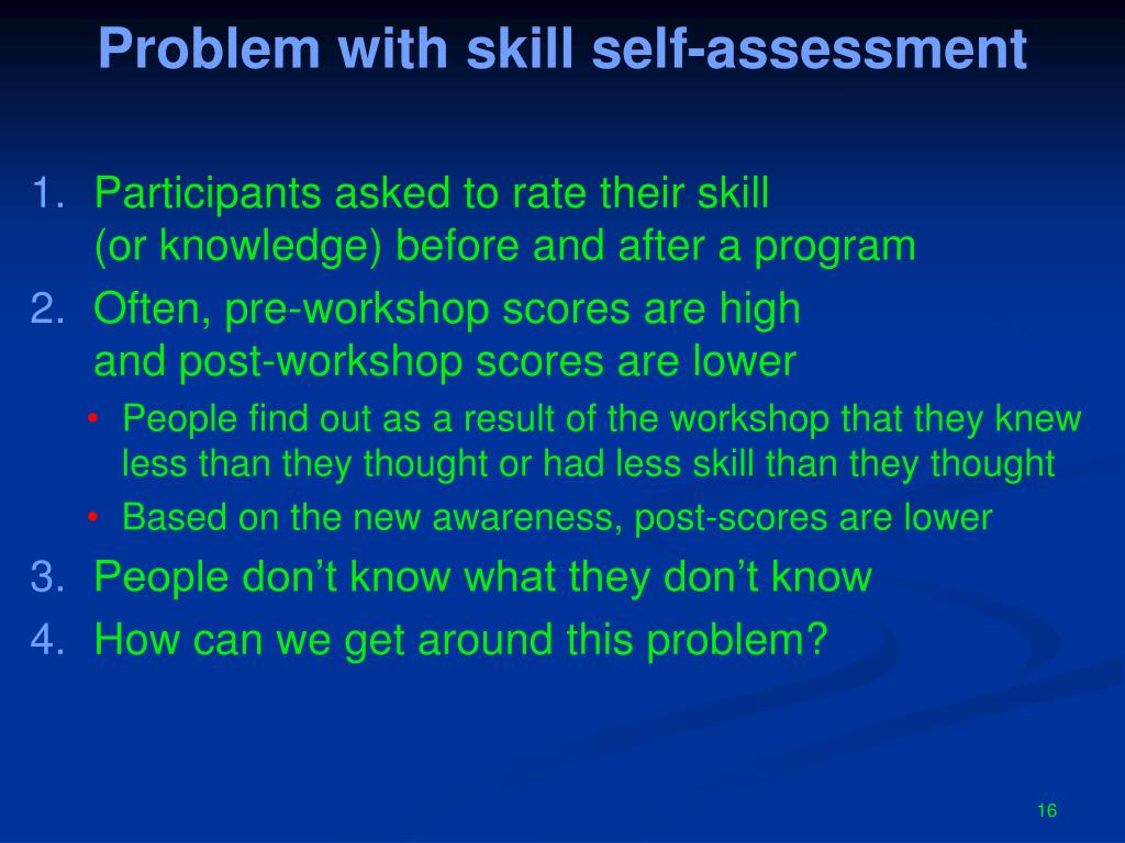 Problem with skill self-assessment • Participants asked to rate their skill (or knowledge) before and after a program • Often, pre-workshop scores are high and post-workshop scores are lower • People find out as a result of the workshop that they knew less than they thought or had less skill than they thought • Based on the new awareness, post-scores are lower • People don’t know what they don’t know • How can we get around this problem?