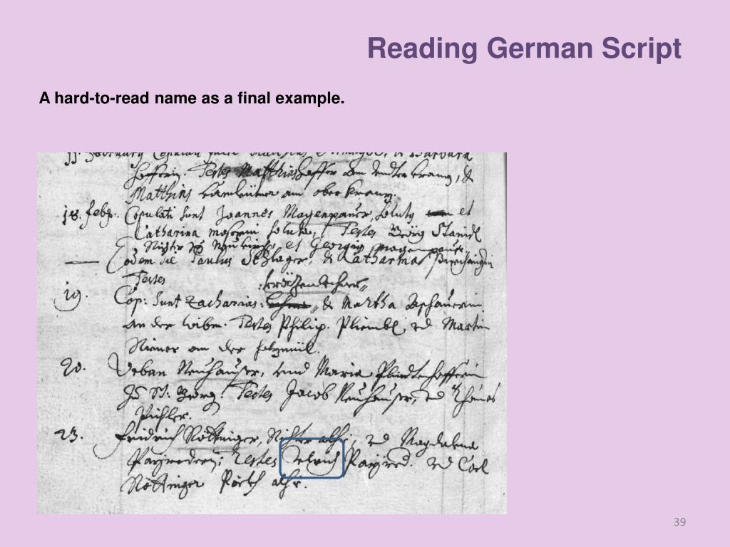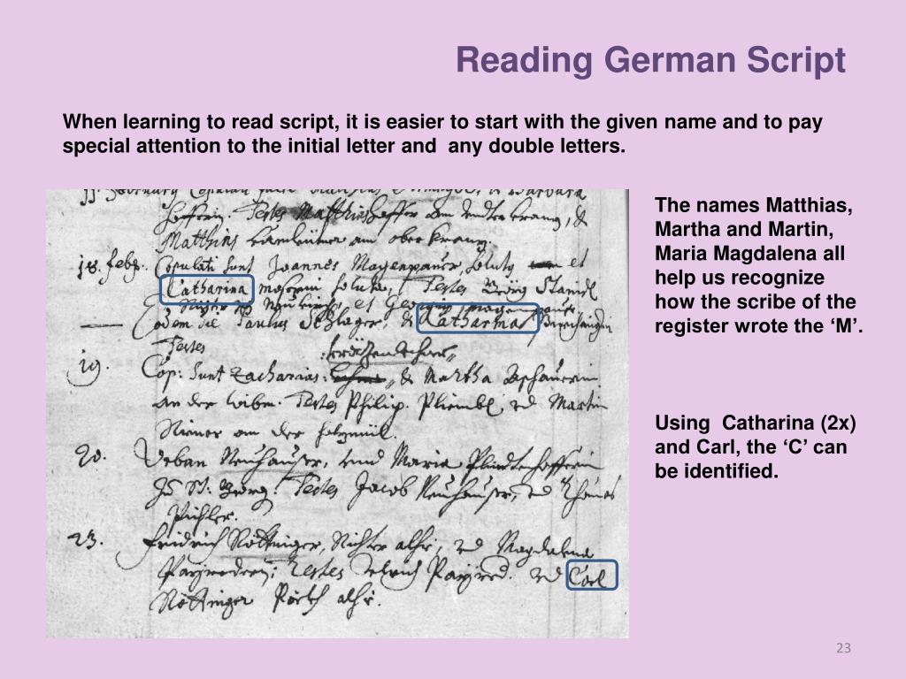 Reading German Script When learning to read script, it is easier to start with the given name and to pay special attention tothe initial letter and any double letters. From the aforementioned structure the given name is easily detected. Lesen All first or given names are now framed. Everyone can now attempt to read the names. Some are more easily read, while others are quite difficult to identify.