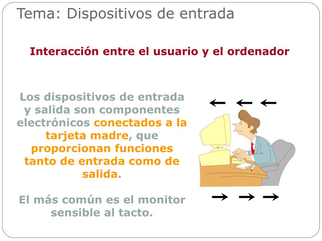 Tema: Dispositivos de entrada Interacción entre el usuario y el ordenador Los dispositivos de entrada y salida son componentes electrónicos conectados a la tarjeta madre, que proporcionan funciones tanto de entrada como de salida. El más común es el monitor sensible al tacto.