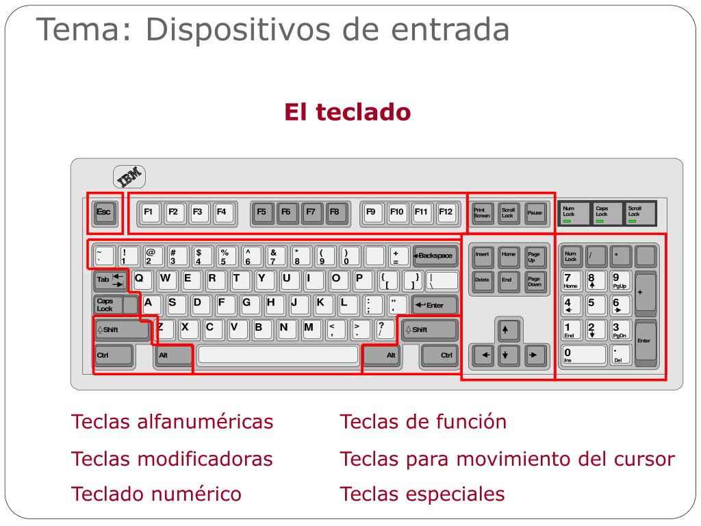 Tema: Dispositivos de entrada El teclado Teclas alfanuméricas Teclas de función Teclas modificadoras Teclas para movimiento del cursor Teclado numérico Teclas especiales