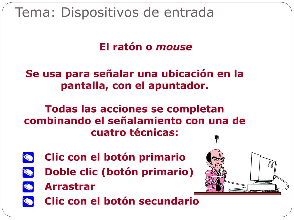 Tema: Dispositivos de entrada El ratón o mouse Se usa para señalar una ubicación en la pantalla, con el apuntador. Todas las acciones se completan combinando el señalamiento con una de cuatro técnicas: Clic con el botón primario Doble clic (botón primario) Arrastrar Clic con el botón secundario