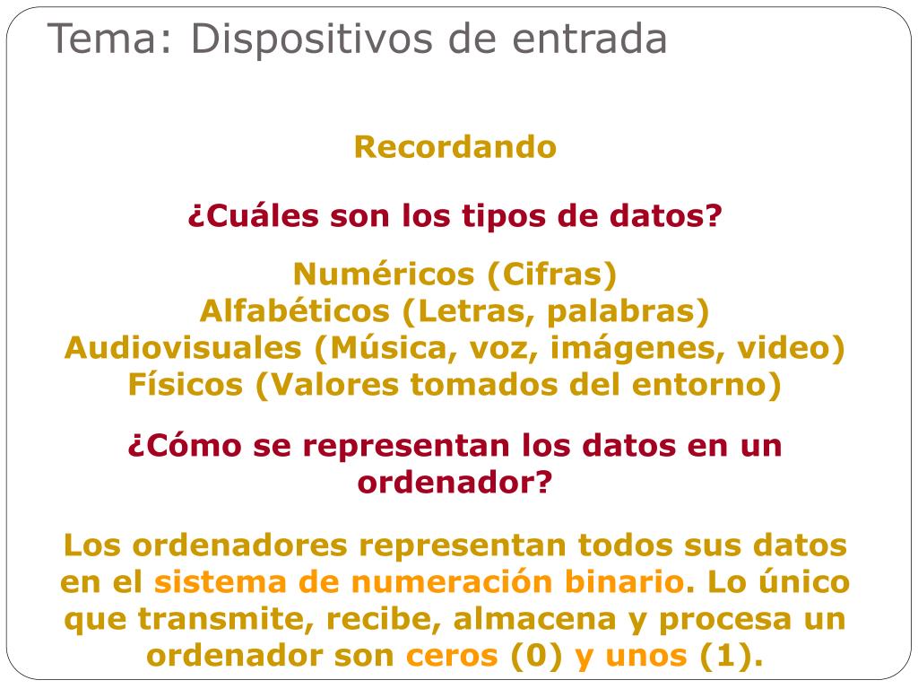 Tema: Dispositivos de entrada Recordando ¿Cuáles son los tipos de datos? Numéricos (Cifras) Alfabéticos (Letras, palabras) Audiovisuales (Música, voz, imágenes, video) Físicos (Valores tomados del entorno) ¿Cómo se representan los datos en un ordenador? Los ordenadores representan todos sus datos en el sistema de numeración binario. Lo único que transmite, recibe, almacena y procesa un ordenador son ceros (0) y unos (1).