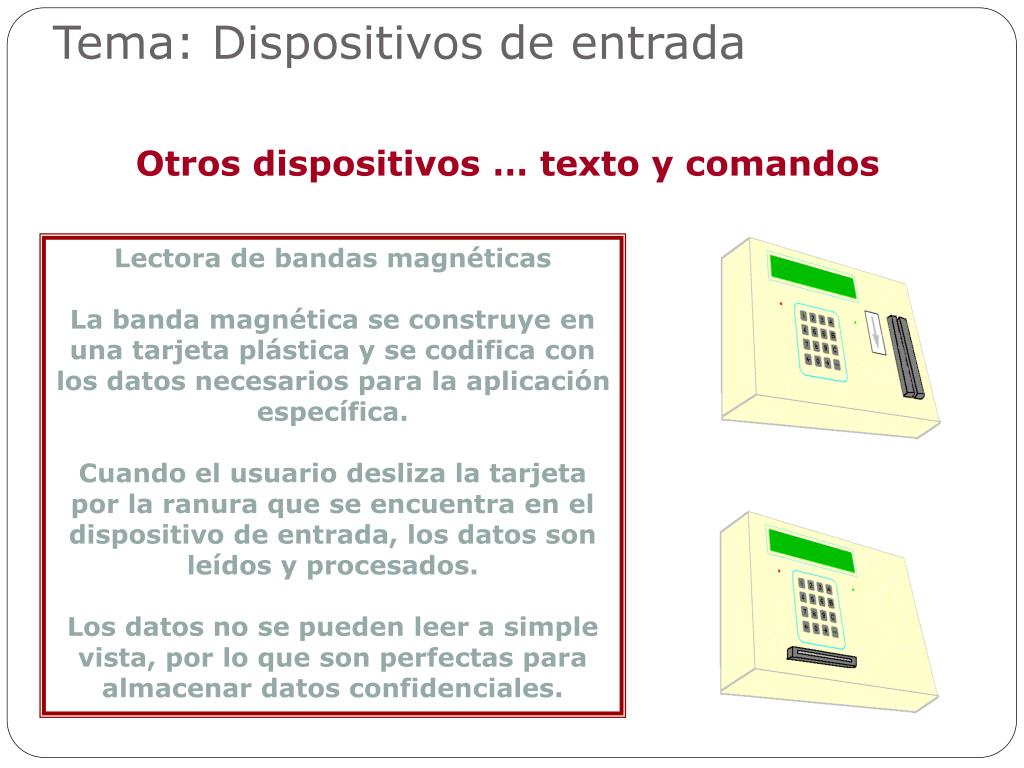 Tema: Dispositivos de entrada Otros dispositivos … texto y comandos Lectora de bandas magnéticas La banda magnética se construye en una tarjeta plástica y se codifica con los datos necesarios para la aplicación específica. Cuando el usuario desliza la tarjeta por la ranura que se encuentra en el dispositivo de entrada, los datos son leídos y procesados. Los datos no se pueden leer a simple vista, por lo que son perfectas para almacenar datos confidenciales.