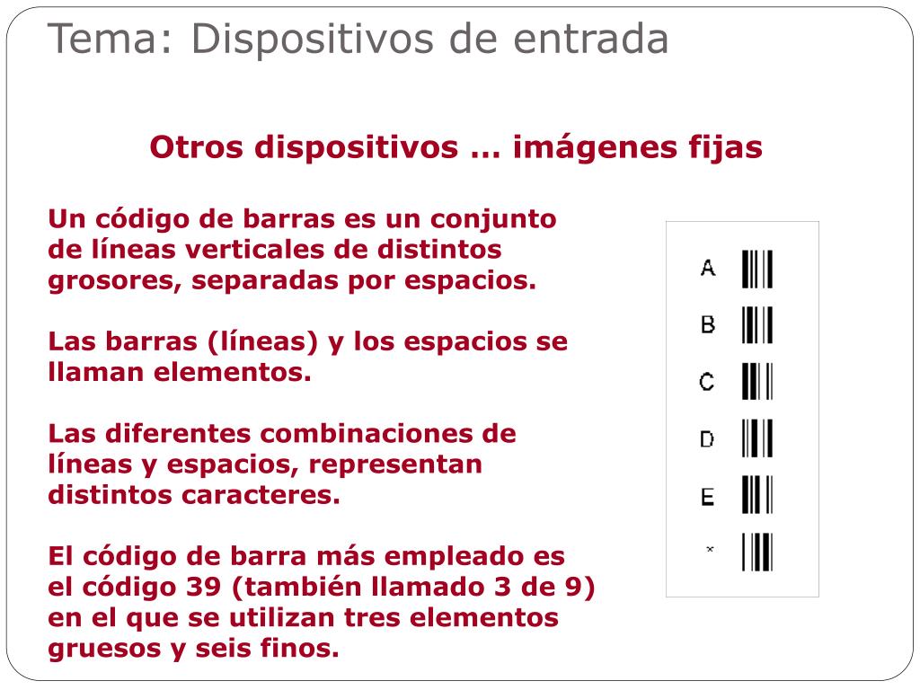 Tema: Dispositivos de entrada Otros dispositivos … imágenes fijas Un código de barras es un conjunto de líneas verticales de distintos grosores, separadas por espacios. Las barras (líneas) y los espacios se llaman elementos. Las diferentes combinaciones de líneas y espacios, representan distintos caracteres. El código de barra más empleado es el código 39 (también llamado 3 de 9) en el que se utilizan tres elementos gruesos y seis finos.