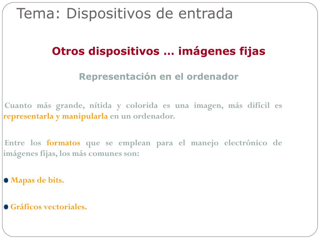 Cuanto más grande, nítida y colorida es una imagen, más difícil es representarla y manipularlaen un ordenador. Entre los formatosque se emplean para el manejo electrónico de imágenes fijas, los más comunes son: Mapas de bits. Gráficos vectoriales. Tema: Dispositivos de entrada Otros dispositivos … imágenes fijas Representación en el ordenador