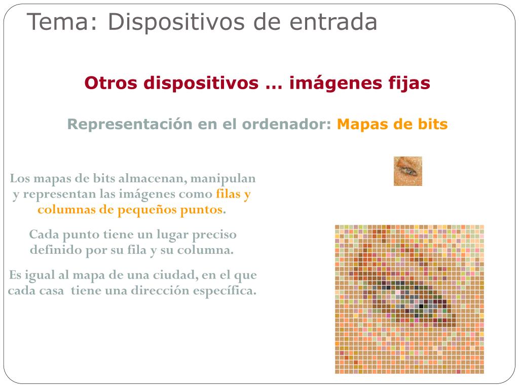 Los mapas de bits almacenan, manipulan y representan las imágenes como filas y columnas de pequeños puntos. Cada punto tiene un lugar preciso definido por su fila y su columna. Es igual al mapa de una ciudad, en el que cada casa tiene una dirección específica. Tema: Dispositivos de entrada Otros dispositivos … imágenes fijas Representación en el ordenador: Mapas de bits