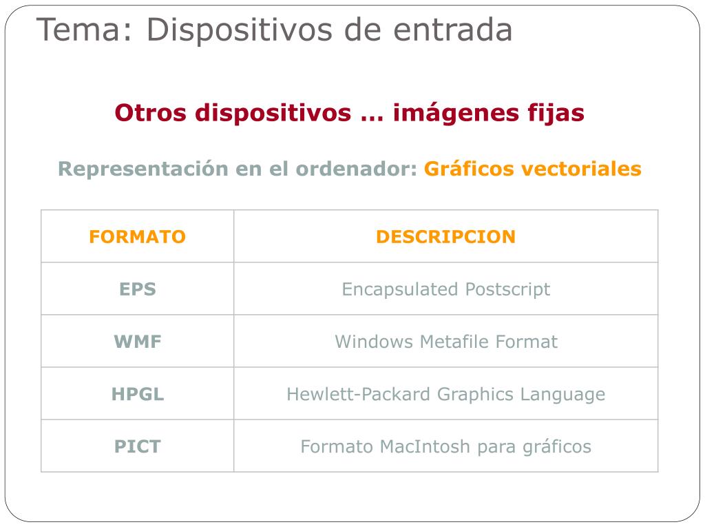 Los gráficos vectoriales emplean fórmulas matemáticas para almacenar, manipular y representar las imágenes. El lugar de cada punto está definido por su relación espacial con otros puntos. Suelen proporcionar mejoresimágenes que los mapas de bits, en la mayoría de las pantallas e impresoras. Tema: Dispositivos de entrada Otros dispositivos … imágenes fijas Representación en el ordenador: Gráficos vectoriales