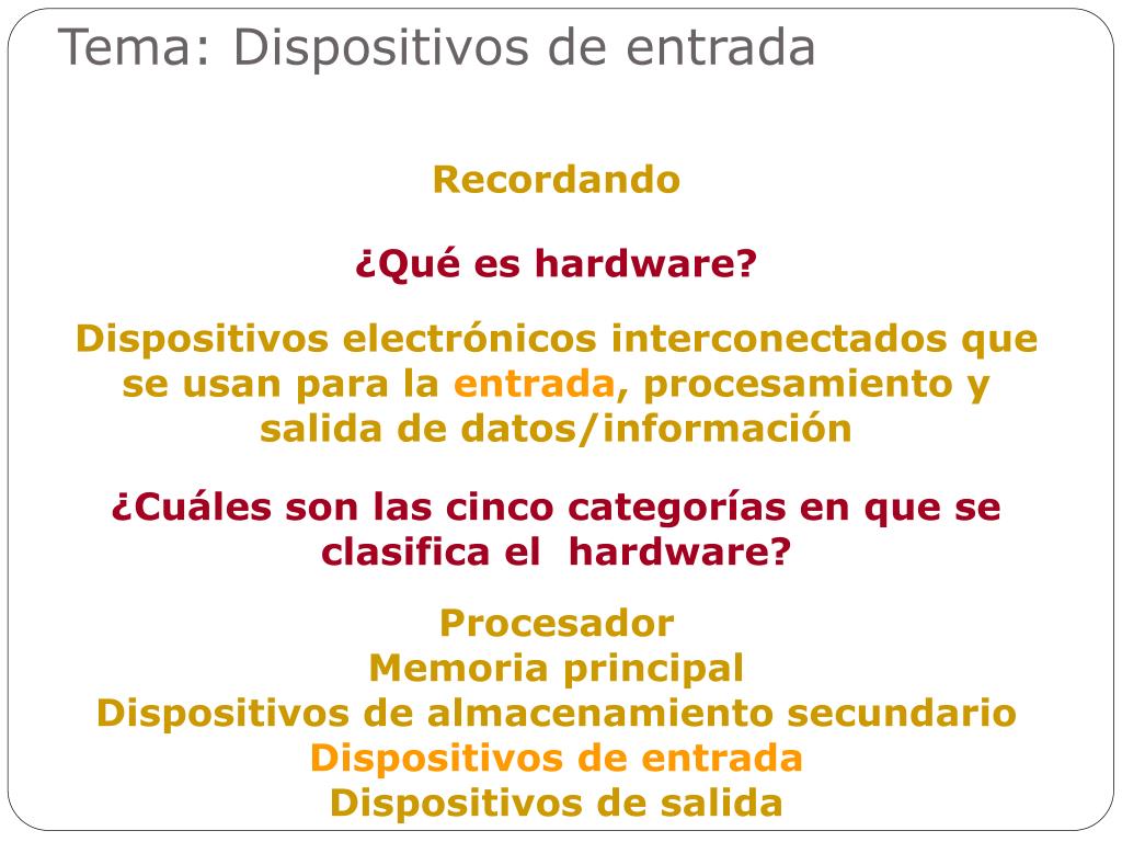 Tema: Dispositivos de entrada Recordando ¿Qué es hardware? Dispositivos electrónicos interconectados que se usan para la entrada, procesamiento y salida de datos/información ¿Cuáles son las cinco categorías en que se clasifica el hardware? Procesador Memoria principal Dispositivos de almacenamiento secundario Dispositivos de entrada Dispositivos de salida