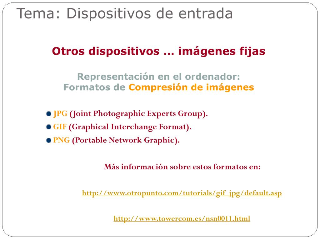 JPG (Joint Photographic Experts Group). GIF (Graphical Interchange Format). PNG (Portable Network Graphic). Más información sobre estos formatos en: http://www.otropunto.com/tutorials/gif_jpg/default.asp http://www.towercom.es/nsn0011.html Tema: Dispositivos de entrada Otros dispositivos … imágenes fijas Representación en el ordenador: Formatos de Compresión de imágenes
