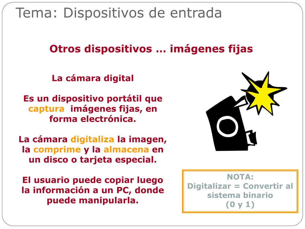 Tema: Dispositivos de entrada Otros dispositivos … imágenes fijas La cámara digital Es un dispositivo portátil que captura imágenes fijas, en forma electrónica. La cámara digitaliza la imagen, la comprime y la almacena en un disco o tarjeta especial. El usuario puede copiar luego la información a un PC, donde puede manipularla. NOTA: Digitalizar = Convertir al sistema binario (0 y 1)