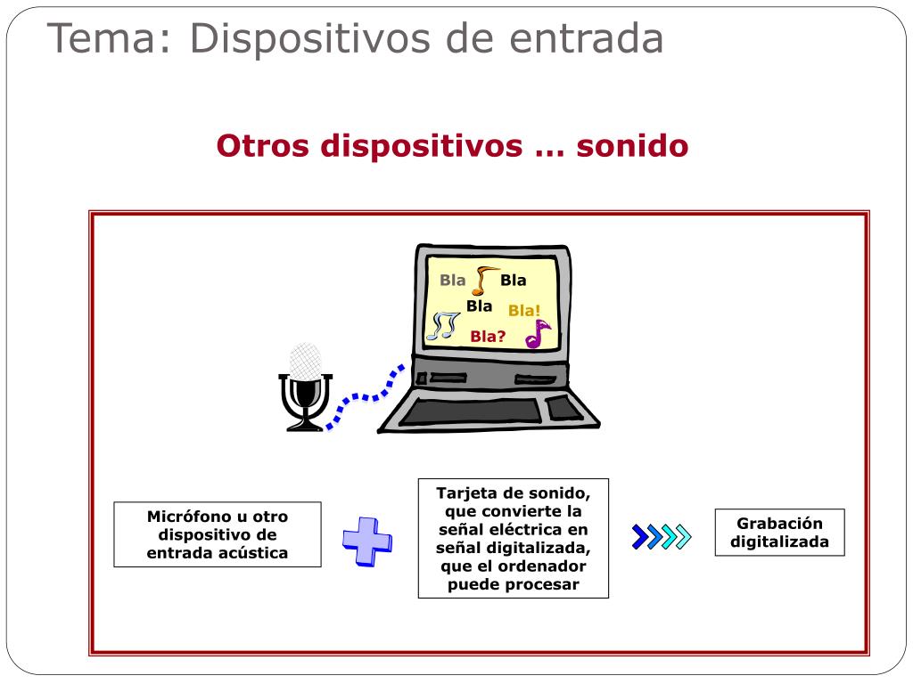 Tema: Dispositivos de entrada Otros dispositivos … sonido Bla Bla Bla Bla! Bla? Tarjeta de sonido, que convierte la señal eléctrica en señal digitalizada, que el ordenador puede procesar Micrófono u otro dispositivo de entrada acústica Grabación digitalizada