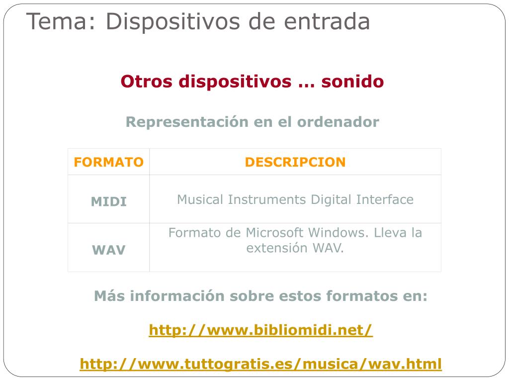 FORMATO DESCRIPCION Musical Instruments Digital Interface MIDI Formato de Microsoft Windows. Lleva la extensión WAV. WAV Tema: Dispositivos de entrada Otros dispositivos … sonido Representación en el ordenador Más información sobre estos formatos en: http://www.bibliomidi.net/ http://www.tuttogratis.es/musica/wav.html