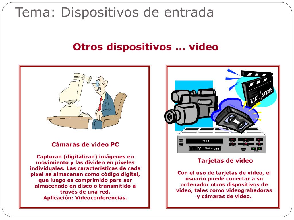 Cámaras de video PC Capturan (digitalizan) imágenes en movimiento y las dividen en pixeles individuales. Las características de cada pixel se almacenan como código digital, que luego es comprimido para ser almacenado en disco o transmitido a través de una red. Aplicación: Videoconferencias. Tarjetas de video Con el uso de tarjetas de video, el usuario puede conectar a su ordenador otros dispositivos de video, tales como videograbadoras y cámaras de video. Tema: Dispositivos de entrada Otros dispositivos … video