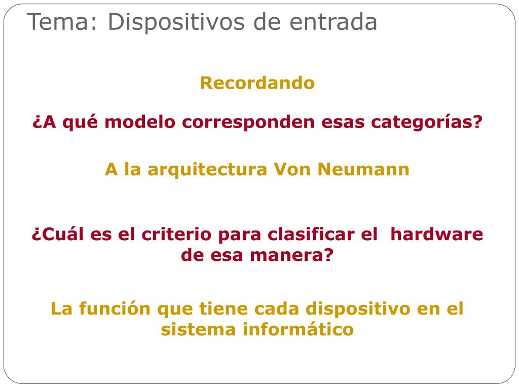 Tema: Dispositivos de entrada Recordando ¿A qué modelo corresponden esas categorías? A la arquitectura Von Neumann ¿Cuál es el criterio para clasificar el hardware de esa manera? La función que tiene cada dispositivo en el sistema informático