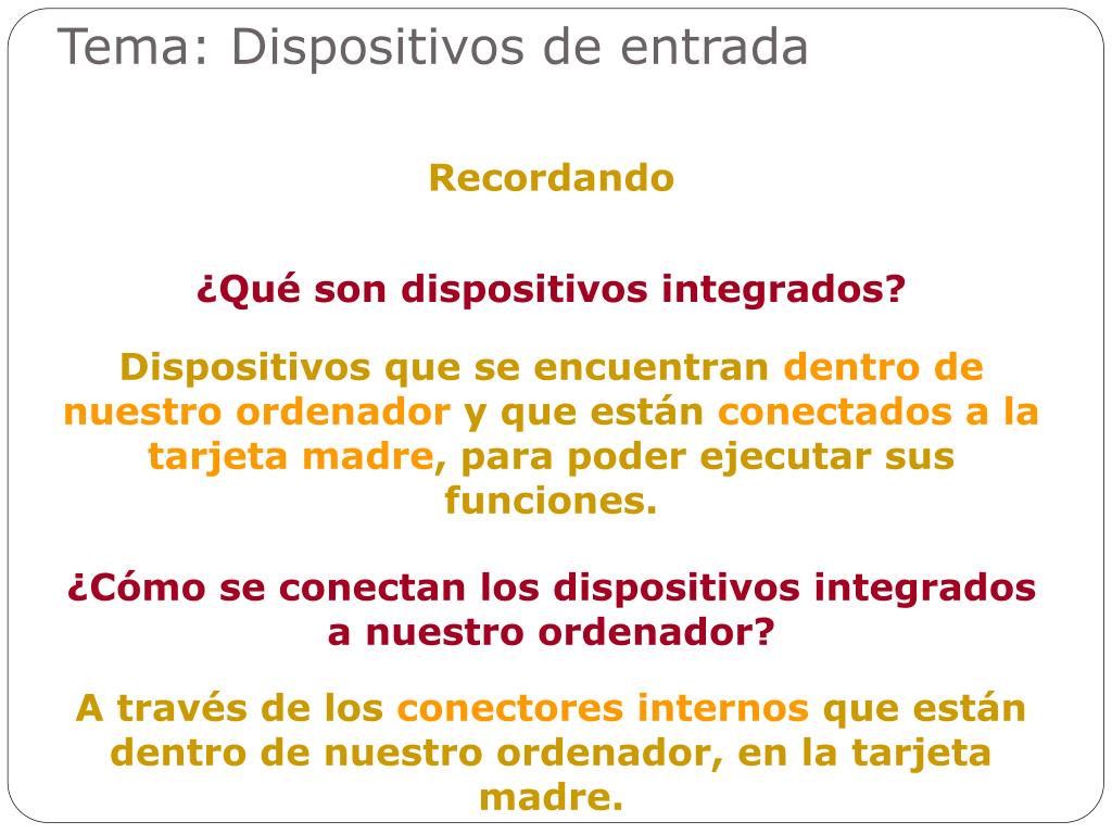 Tema: Dispositivos de entrada Recordando ¿Qué son dispositivos integrados? Dispositivos que se encuentran dentro de nuestro ordenador y que están conectados a la tarjeta madre, para poder ejecutar sus funciones. ¿Cómo se conectan los dispositivos integrados a nuestro ordenador? A través de los conectores internos que están dentro de nuestro ordenador, en la tarjeta madre.