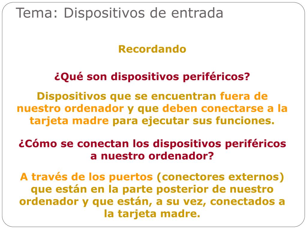 Tema: Dispositivos de entrada Recordando ¿Qué son dispositivos periféricos? Dispositivos que se encuentran fuera de nuestro ordenador y que deben conectarse a la tarjeta madre para ejecutar sus funciones. ¿Cómo se conectan los dispositivos periféricos a nuestro ordenador? A través de los puertos (conectores externos) que están en la parte posterior de nuestro ordenador y que están, a su vez, conectados a la tarjeta madre.