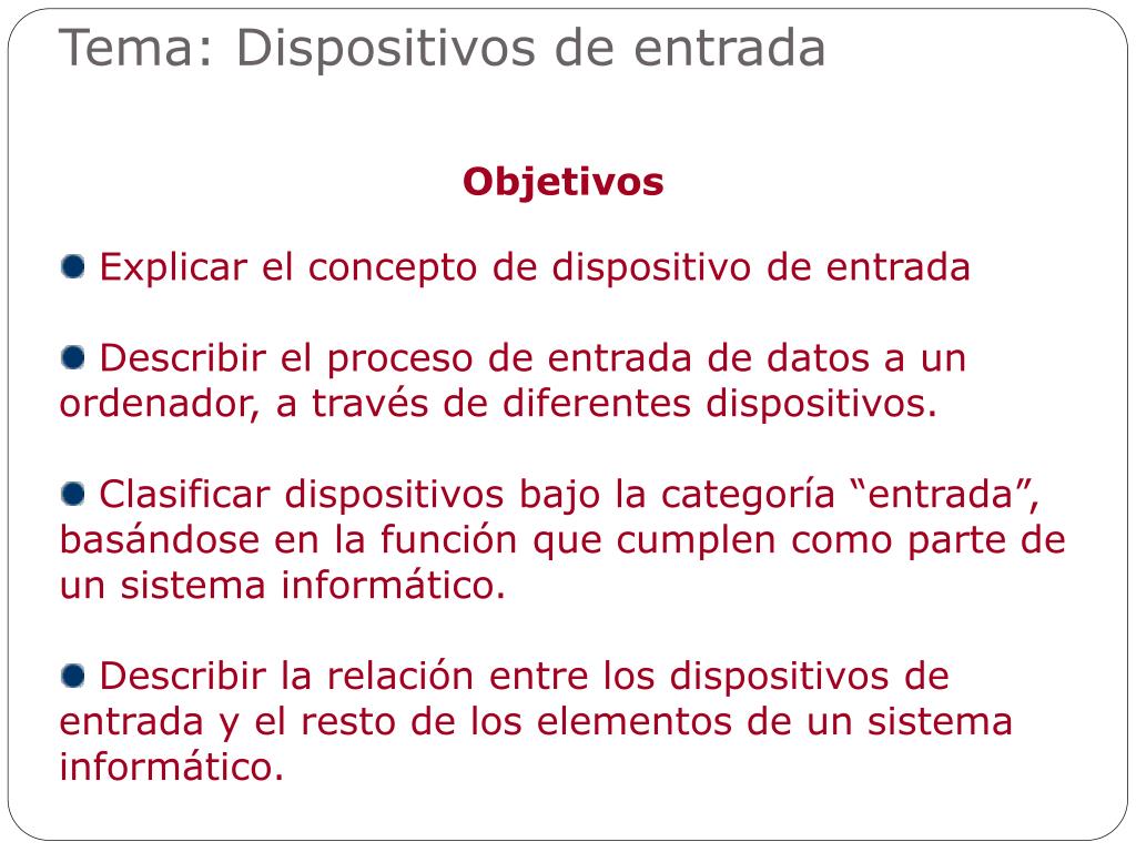 Tema: Dispositivos de entrada Objetivos • Explicar el concepto de dispositivo de entrada • Describir el proceso de entrada de datos a un ordenador, a través de diferentes dispositivos. • Clasificar dispositivos bajo la categoría “entrada”, basándose en la función que cumplen como parte de un sistema informático. • Describir la relación entre los dispositivos de entrada y el resto de los elementos de un sistema informático.