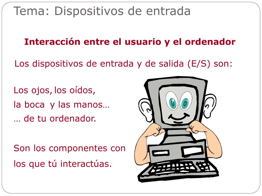 Tema: Dispositivos de entrada Interacción entre el usuario y el ordenador Los dispositivos de entrada y de salida (E/S) son: Los ojos, los oídos, la boca y las manos… … de tu ordenador. Son los componentes con los que tú interactúas.