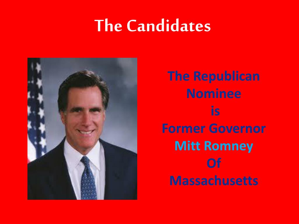The Candidates The Republican Nominee is Former Governor Mitt Romney Of Massachusetts