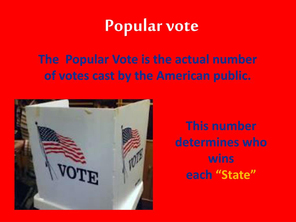 Popular vote The Popular Vote is the actual number of votes cast by the American public. This number determines who wins each “State”