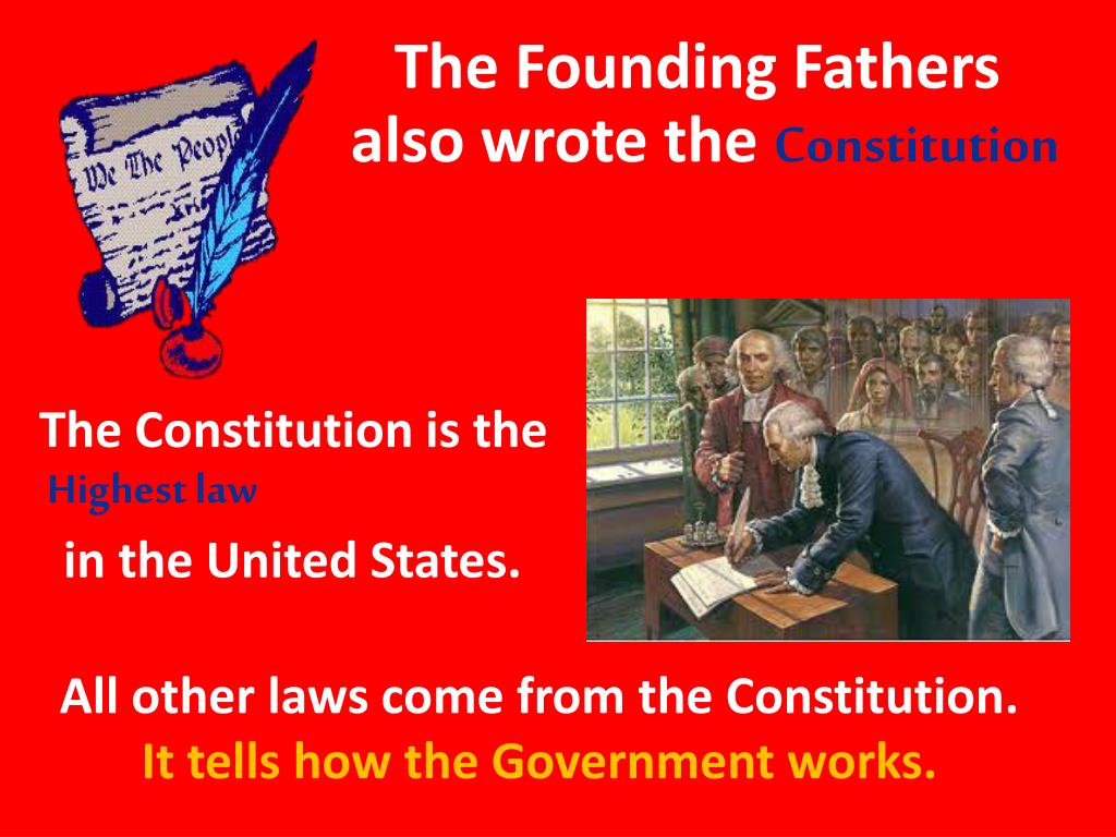 The Founding Fathers also wrote the Constitution TheConstitution is the Highest law in the United States. All other laws come from the Constitution. It tells how the Government works.