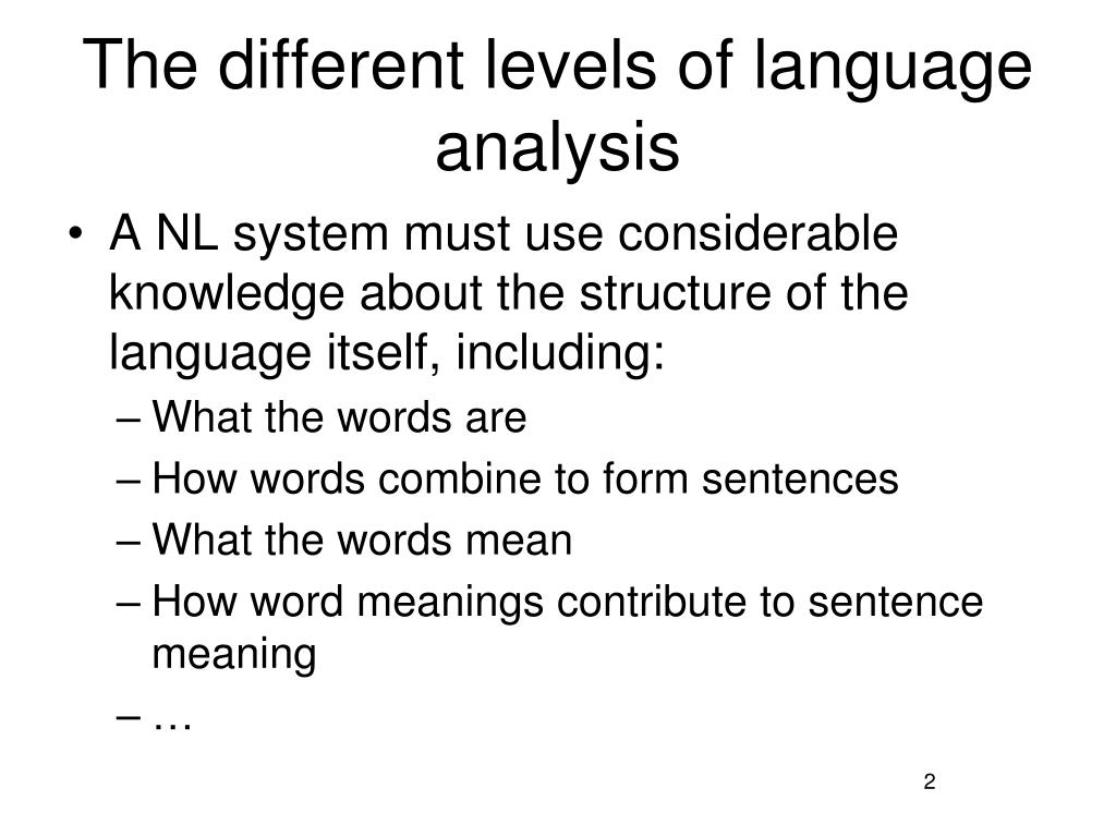 The different levels of language analysis • A NL system must use considerable knowledge about the structure of the language itself, including: • What the words are • How words combine to form sentences • What the words mean • How word meanings contribute to sentence meaning • …