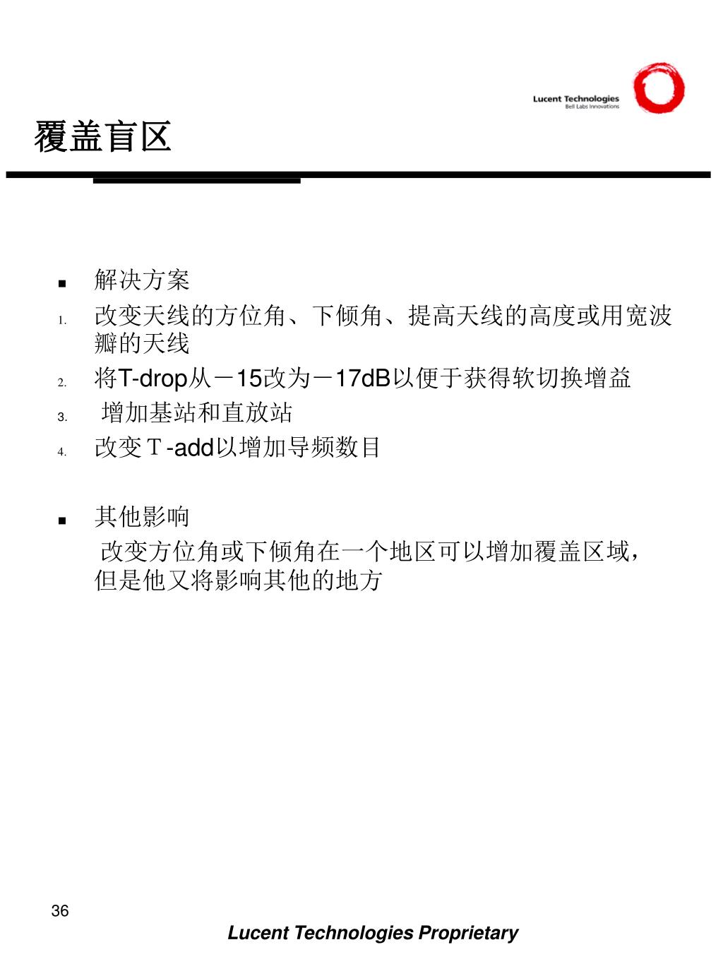 系统范围优化 3.所有的优化步骤和簇优化中相同。 集中问题区域 当叁数改动后,路测周围的区域,确保仍然正常工作。 注意: 在系统优化完成以后 , 问题区域可能仍然存在。 一个例子是一个覆盖盲区将会被将来的增加的基站覆盖。 这样的项目一定要和朗讯和客户同意的解决方案一起记录在案。因为合同和付款需要这样的确认,这需要由有适当权威的经理做。