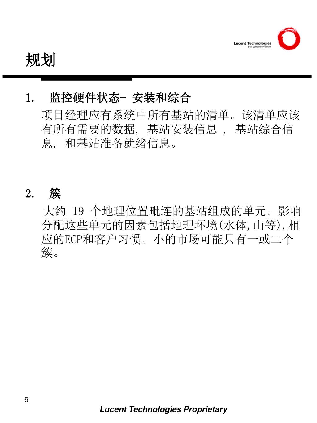 规划 1. 监控硬件状态- 安装和综合 项目经理应有系统中所有基站的清单。该清单应该有所有需要的数据, 基站安装信息 , 基站综合信息, 和基站准备就绪信息。 2. 簇 大约 19 个地理位置毗连的基站组成的单元。影响分配这些单元的因素包括地理环境(水体,山等),相应的ECP和客户习惯。小的市场可能只有一或二个簇。