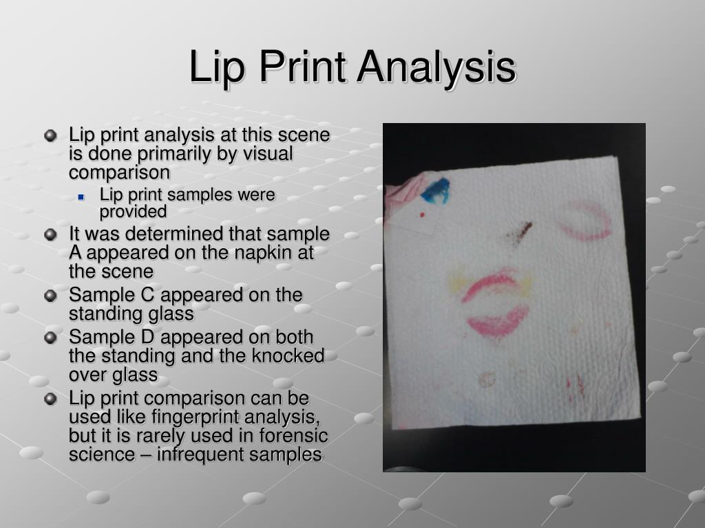 Lip Print Analysis • Lip print analysis at this scene is done primarily by visual comparison • Lip print samples were provided • It was determined that sample A appeared on the napkin at the scene • Sample C appeared on the standing glass • Sample D appeared on both the standing and the knocked over glass • Lip print comparison can be used like fingerprint analysis, but it is rarely used in forensic science – infrequent samples