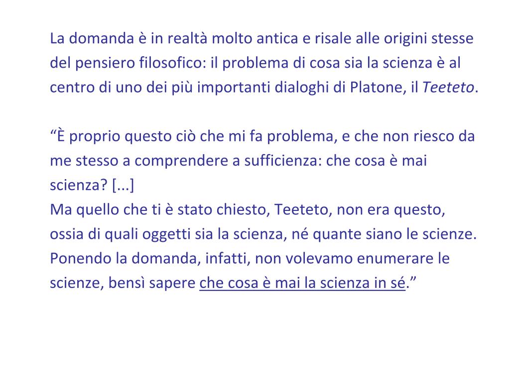 La domanda è in realtà molto antica e risale alle origini stesse del pensiero filosofico: il problema di cosa sia la scienza è al centro di uno dei più importanti dialoghi di Platone, il Teeteto. “È proprio questo ciò che mi fa problema, e che non riesco da me stesso a comprendere a sufficienza: che cosa è mai scienza? [...] Ma quello che ti è stato chiesto, Teeteto, non era questo, ossia di quali oggetti sia la scienza, né quante siano le scienze. Ponendo la domanda, infatti, non volevamo enumerare le scienze, bensì sapere che cosa è mai la scienza in sé.”