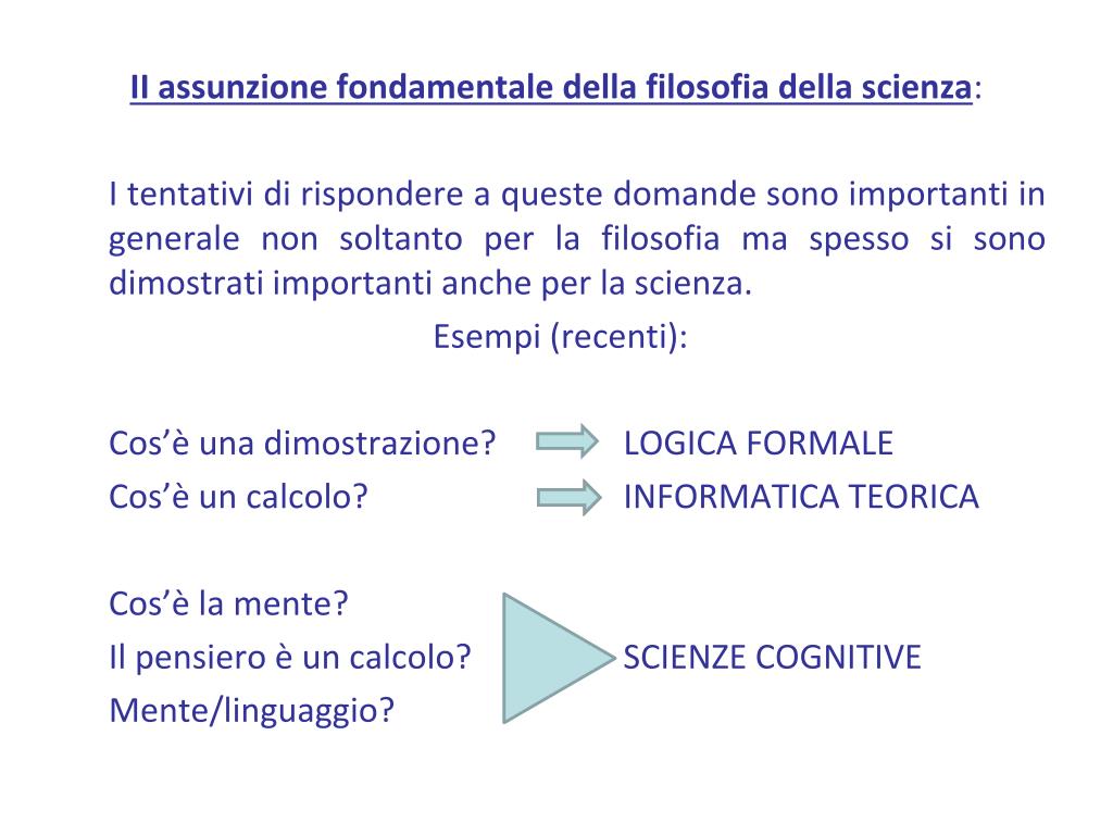 II assunzione fondamentale della filosofia della scienza: I tentativi di rispondere a queste domande sono importanti in generale non soltanto per la filosofia ma spesso si sono dimostrati importanti anche per la scienza. Esempi (recenti): Cos’è una dimostrazione? LOGICA FORMALE Cos’è un calcolo? INFORMATICA TEORICA Cos’è la mente? Il pensiero è un calcolo? SCIENZE COGNITIVE Mente/linguaggio?