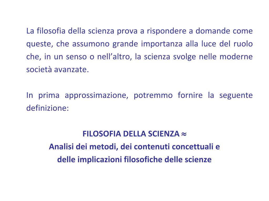La filosofia della scienza prova a rispondere a domande come queste, che assumono grande importanza alla luce del ruolo che, in un senso o nell’altro, la scienza svolge nelle moderne società avanzate. In prima approssimazione, potremmo fornire la seguente definizione: FILOSOFIA DELLA SCIENZA Analisi dei metodi, dei contenuti concettuali e delle implicazioni filosofiche delle scienze