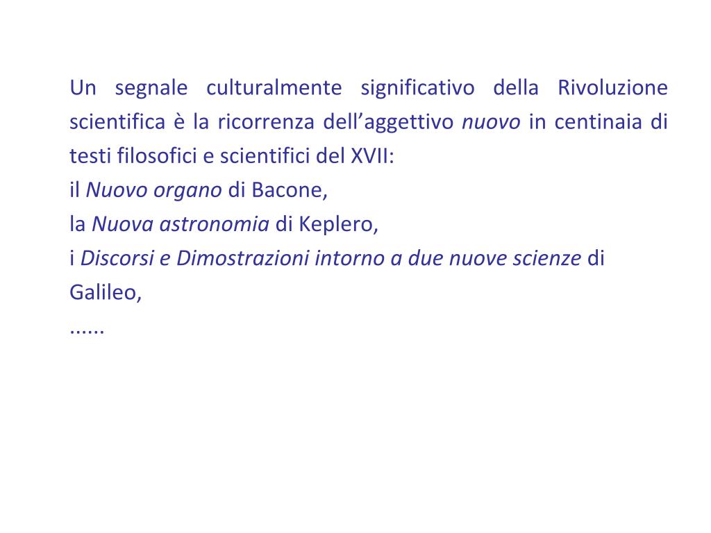 Un segnale culturalmente significativo della Rivoluzione scientifica è la ricorrenza dell’aggettivo nuovo in centinaia di testi filosofici e scientifici del XVII: il Nuovo organo di Bacone, la Nuova astronomia di Keplero, i Discorsi e Dimostrazioni intorno a due nuove scienze di Galileo, ......