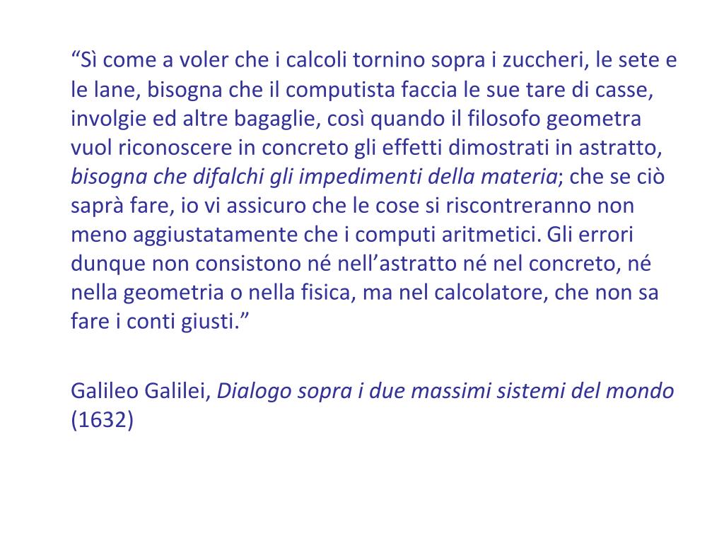 “Sì come a voler che i calcoli tornino sopra i zuccheri, le sete e le lane, bisogna che il computista faccia le sue tare di casse, involgie ed altre bagaglie, così quando il filosofo geometra vuol riconoscere in concreto gli effetti dimostrati in astratto, bisogna che difalchi gli impedimenti della materia; che se ciò saprà fare, io vi assicuro che le cose si riscontreranno non meno aggiustatamente che i computi aritmetici. Gli errori dunque non consistono né nell’astratto né nel concreto, né nella geometria o nella fisica, ma nel calcolatore, che non sa fare i conti giusti.” Galileo Galilei, Dialogo sopra i due massimi sistemi del mondo (1632)